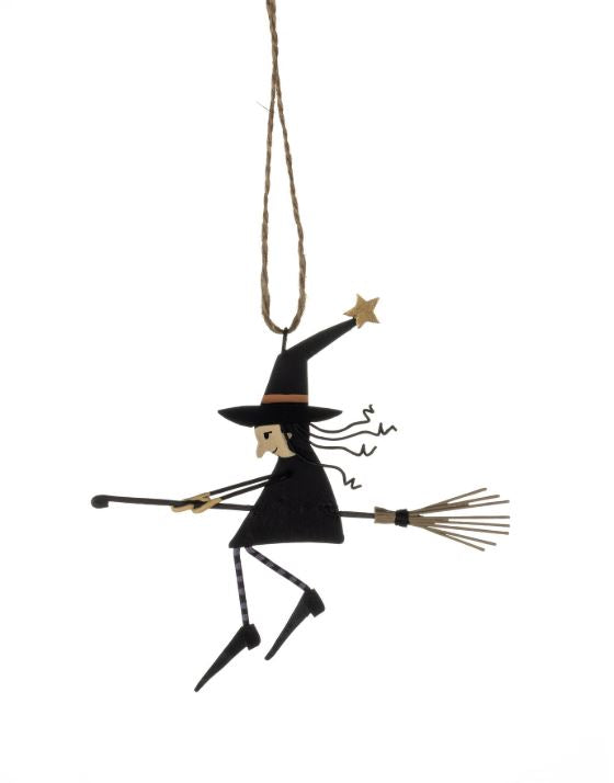 It's time for the ghoulies and ghosties and long-leggedy beasties and of course, a witch on a broomstick! This flying lady hanging decoration from Shoeless Joe is the perfect choice for your Halloween party. She is made of hand painted metal and measures approximately H 10 x W 12 x D 0.1 cm.