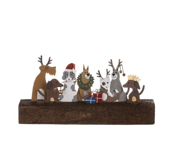 The dogs, all decked out in Christmas headgear, are clearly having a whale of a time celebrating the festive season. Mounted on a plinth, this joyous scene measures approximately 9 x 18 x 4 cm.