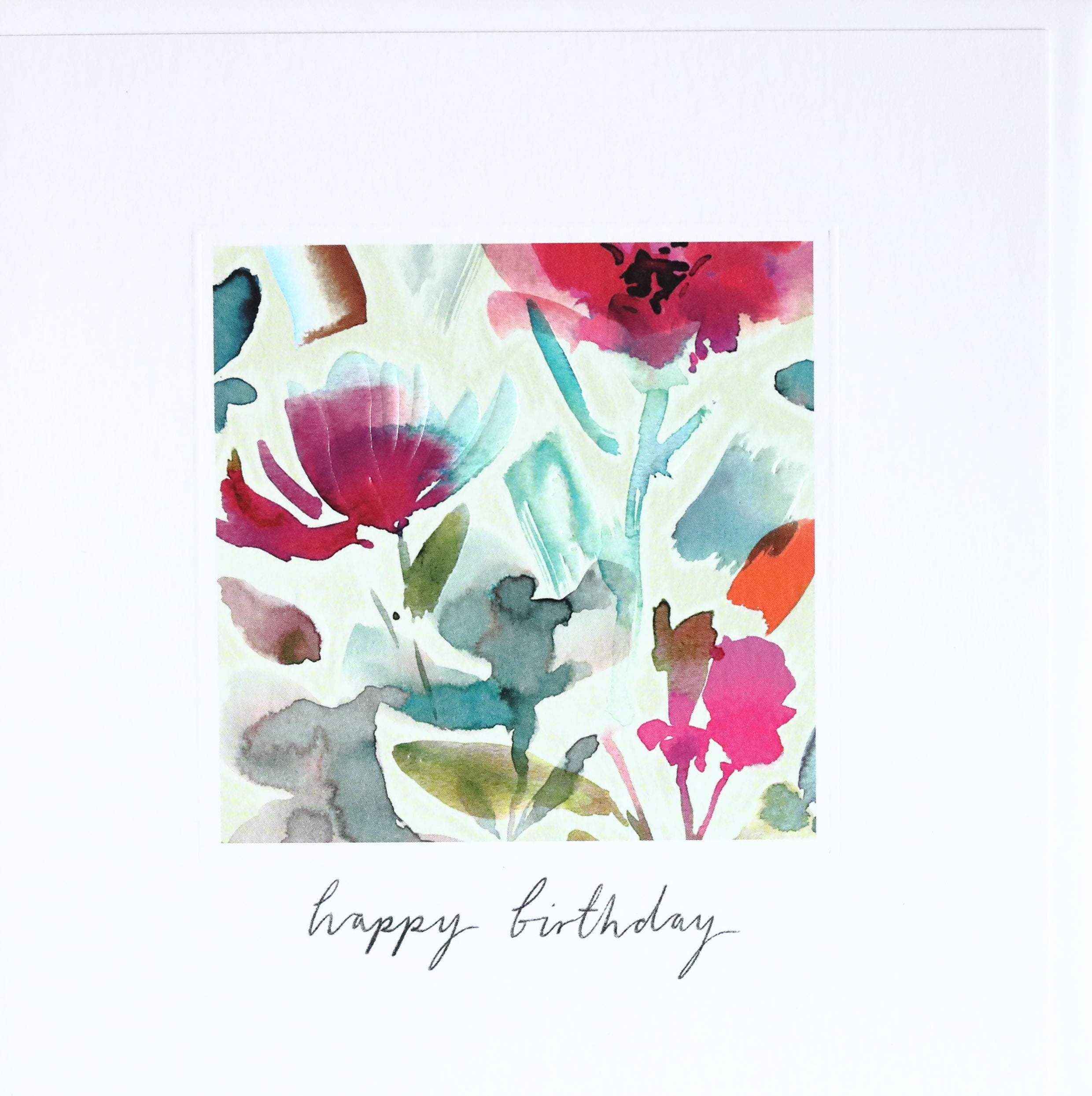 Stylised Floral Happy Birthday card - blank inside for your own message. Measures 158 x 158 mm - comes with white envelope.