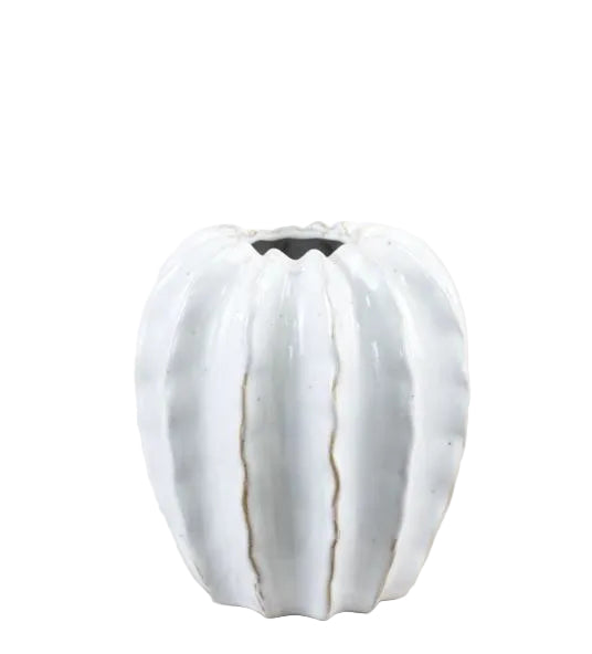 A striking ceramic vase inspired by the organic beauty of seed pods. Standing 15 cm tall, this sculptural piece features a subtle white glaze with textured detailing that captures the natural ridges and curves of botanical forms. Perfect for displaying fresh or dried flowers, or as a standalone decorative accent. Handcrafted ceramic construction brings timeless elegance to any room.