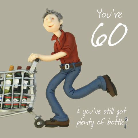 "You're 60 & You've Still Got Plenty of Bottle!" greeting card from Holy Mackerel with artwork from the inimitable Erica Sturla. Blank inside for your own message. White envelope included. Size 150 x 150 mm